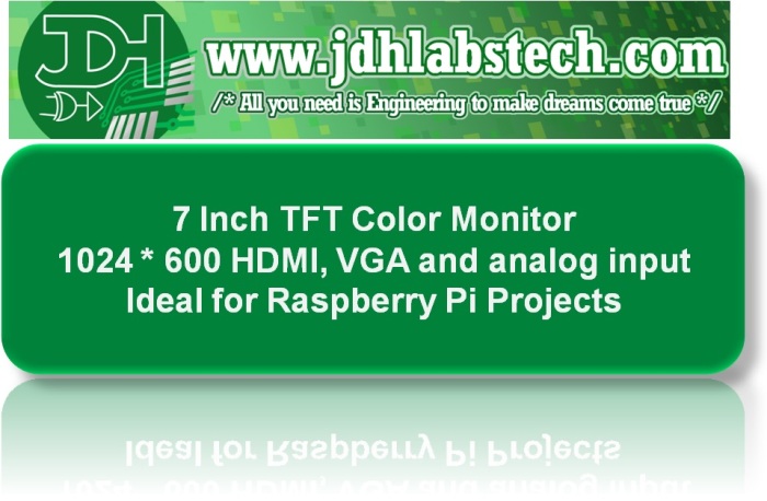 7-inch TFT color monitor with VGA, HDMI and AV inputs, 1024*600 pixel resolution. Ideal for Raspberry Pi projects!