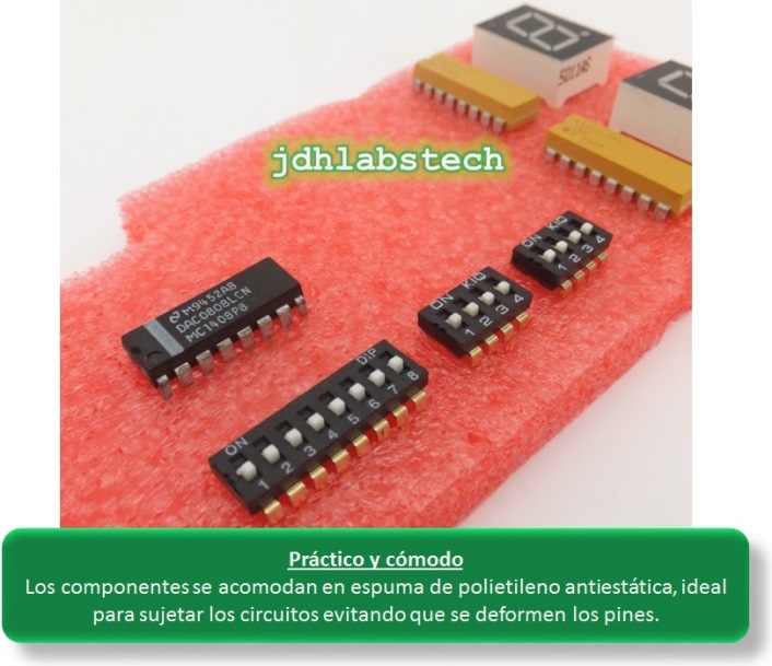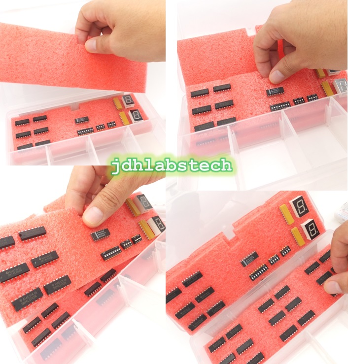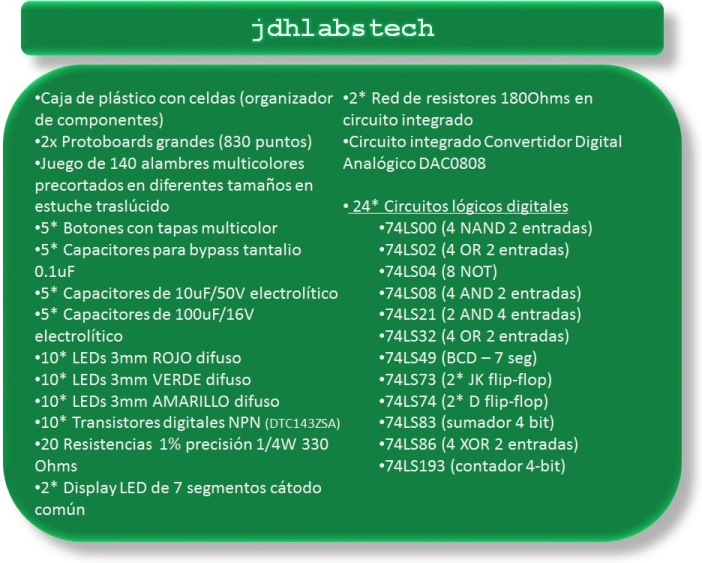 24 circuitos lógicos (Serie 74LSxx), 2 tablillas para prototipos protoboards, LEDs, microinterruptores y muchos más; todo en un práctico y cómodo organizador de plástico