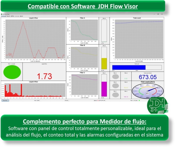 Diseño compacto, medidor de flujo con una alarma programable y ¡compatible con el software JDH Flow Visor!